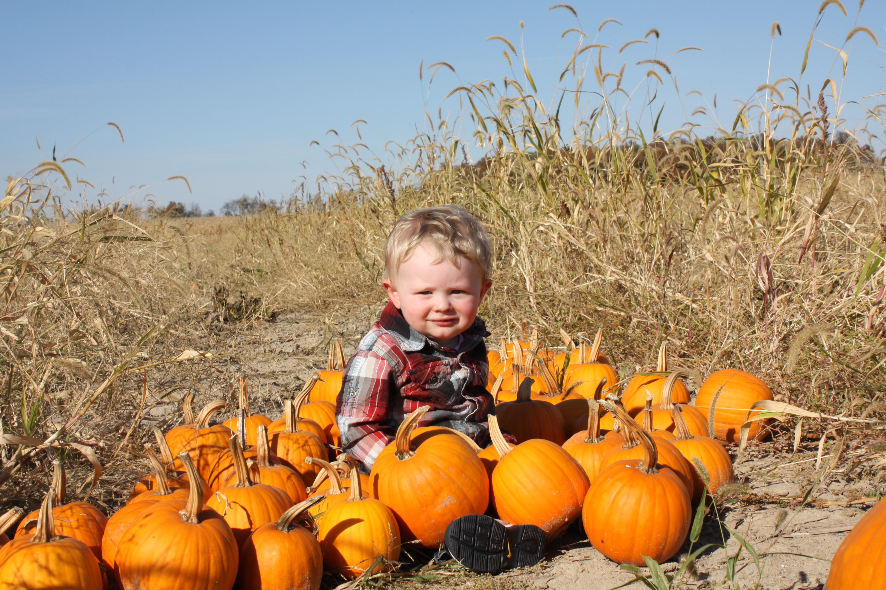 It just so happens that we have some good friends who live on a family farm. Devin and Nancy Bell live on Clear Weather Farm and primarily grow corn and soybeans, but also have a pumpkin patch and a small herd of dairy cows. We visited the pumpkin patch and picked out a few for Blue, but it was the cows that stole the show.